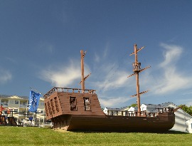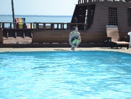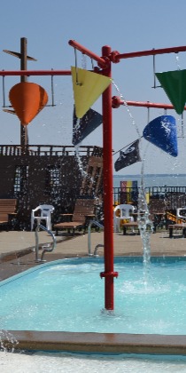 Our upper pool area has round tables with umbrellas that are great for having lunch, beverages and snacks. It also features a pirate ship sundeck.